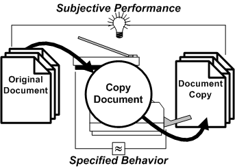 2.2.8 Specified behavior is confirmable and adjusted for. In the case of an appliance such as an office copier, there are procedures for confirming that specified behavior is being delivered. This can be accompanied by the use of special test documents that are used for adjusting the appliance to operate reliably within tolerances for the specified behavior. There may be user-accessible adjustments that can also be made without requiring a specialist. Notice that the specified behavior is at the edge of the interfaces of the device, in contrast with the subjective performance which, in this case, is concerned with the relationship between the original document and the document copy as reflected in the intention of the operator as much as the regulated behavior of the appliance.